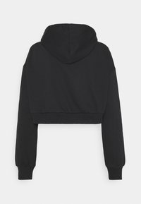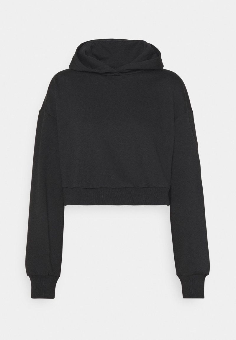 Sweat à capuche court noir en tissu doux, doté d'une large capuche, de manches longues avec poignets ajustés et d'un ourlet droit.