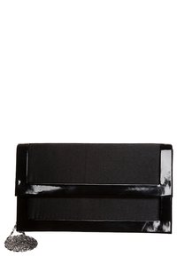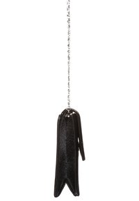 Femme portant un haut noir à manches longues, un pantalon slim à motifs, des escarpins noirs, tenant un sac à bandoulière noir avec une chaîne sur l'épaule.
