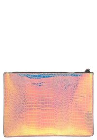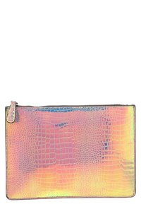 Femme en robe noire sans manches avec une fente à fermeture éclair à l'avant, tenant une pochette texturée irisée bleue et portant des talons compensés noirs.