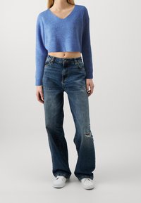 Femme portant un pull court côtelé bleu à col en V et un jean denim bleu foncé taille haute, debout devant un fond uni.