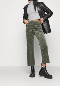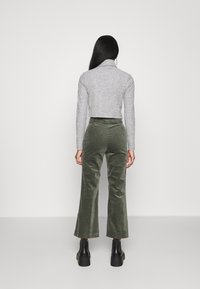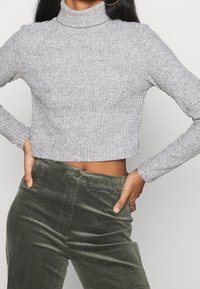 Haut court à col roulé côtelé gris avec des manches longues, associé à un pantalon en corduroy vert olive avec une fermeture à bouton.
