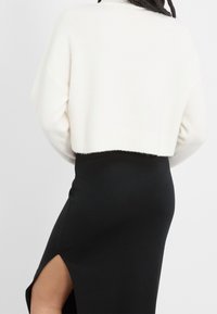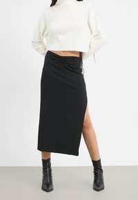 Personne ajustant le col d'un pull court blanc, portant une jupe noire taille haute avec une fente sur la cuisse et une taille froncée.