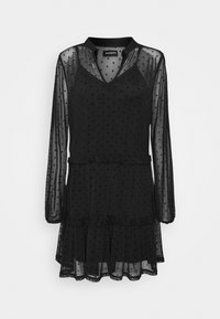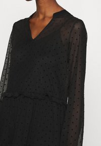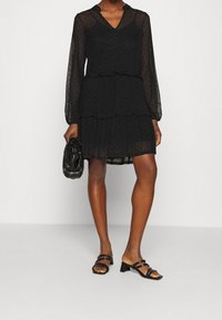 Robe noire à volants en tissu transparent avec un motif à pois, décolleté en V et manches longues, associée à des sandales à talons carrés noires.