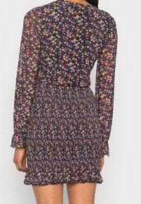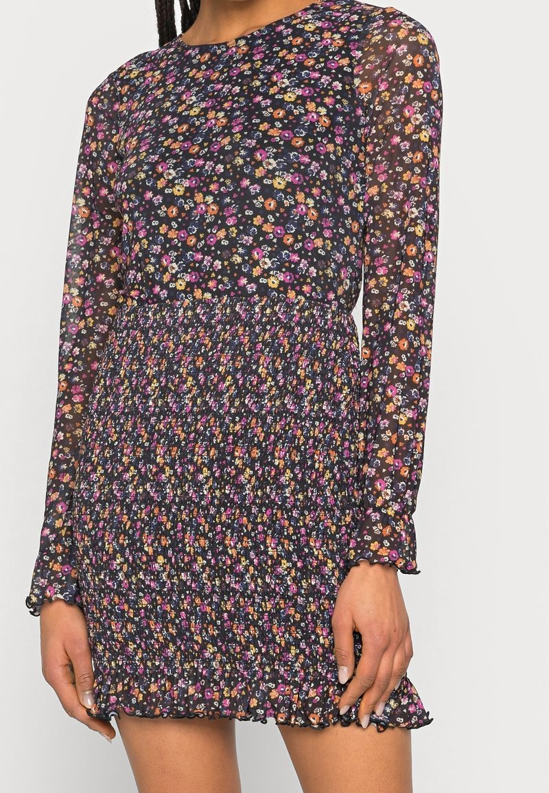 Femme portant une robe noire à manches longues avec de petits motifs floraux multicolores et une jupe smockée à ourlet volanté.