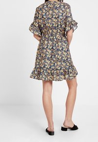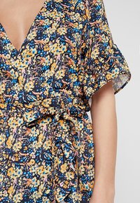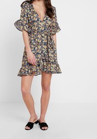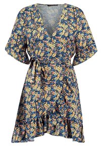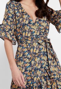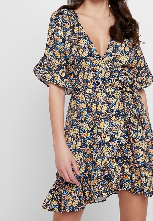 Robe portefeuille fleurie avec un décolleté en V profond, des manches courtes à volants et un ourlet évasé. Présente un fond sombre avec des motifs floraux jaunes et bleus.