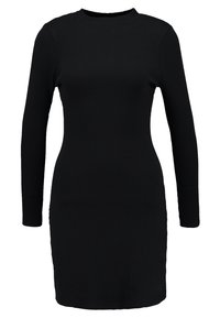Robe noire à manches longues côtelée avec un col rond, une coupe ajustée et des fentes latérales à l'ourlet pour faciliter les mouvements.