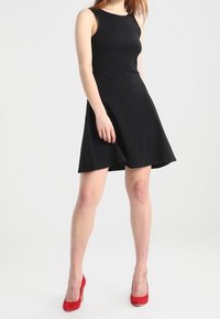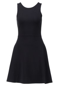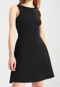 Robe noire sans manches avec un corsage ajusté et une jupe évasée, en tissu lisse. Design simple sans motifs ni accents visibles.