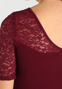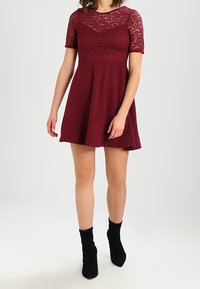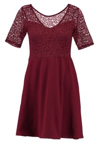 Robe bordeaux avec un corsage en dentelle, des manches courtes et une jupe évasée, fabriquée à partir d'un tissu doux avec une finition texturée.