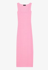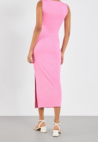 Robe midi rose sans manches avec un décolleté carré, une texture côtelée et une fente latérale. Associée à des sandales blanches à brides.