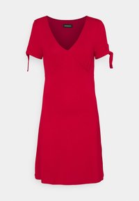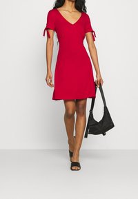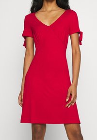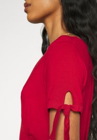 Robe rouge à manches courtes avec décolleté en V et détails froncés. Les manches présentent des accents de nœud, et le tissu semble doux et lisse.