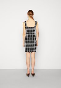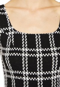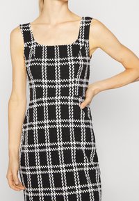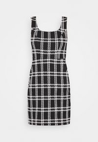 Robe à carreaux noir et blanc avec un décolleté carré, une silhouette ajustée et des bretelles larges. Portée avec des sandales noires à brides.