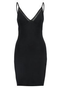 Robe noire ajustée avec fines bretelles spaghetti, décolleté en V et détails en tulle sur les bretelles, réalisée en tissu lisse.