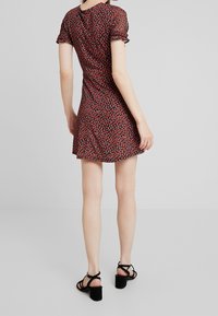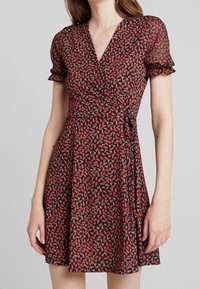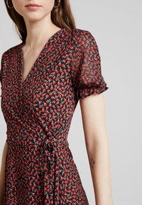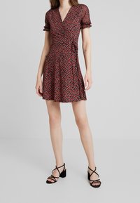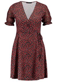Robe portefeuille florale rouge avec des manches courtes bouffantes et transparentes, décolleté en V et jupe évasée. Le matériau semble léger avec une finition texturée.