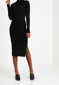 Femme portant une robe midi à manches longues côtelée noire avec une fente sur le côté, associée à des mules noires à talons, se tenant devant un fond blanc.
