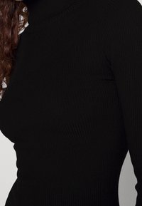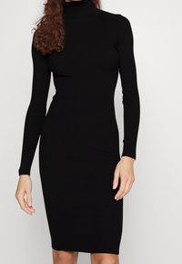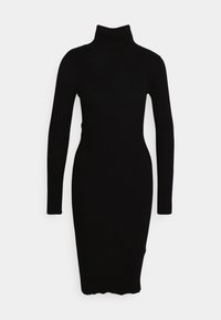 Robe en maille côtelée noire avec un col roulé haut, des manches longues, une silhouette ajustée et une longueur au genou. Texture lisse et confection sans coutures.