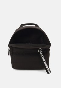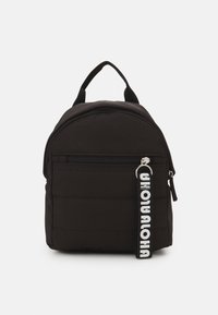 Petit sac à dos noir avec une poche zippée à l'avant et un porte-clés noir avec texte blanc suspendu à la tirette du zip.