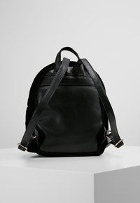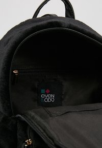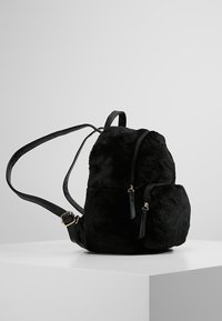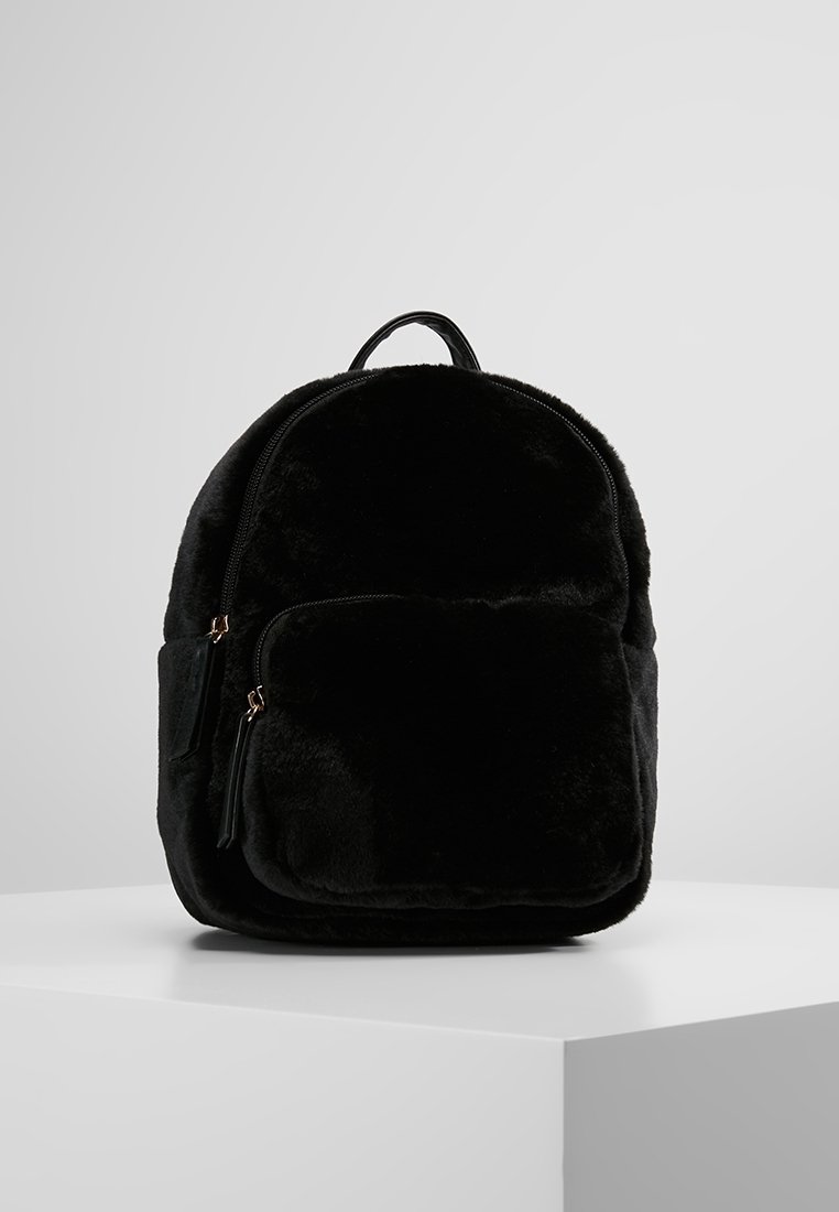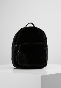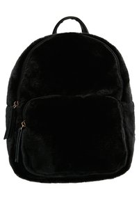 Sac à dos en peluche noire avec poche zippée à l'avant et poignée supérieure, présenté sur un piédestal blanc sur fond gris.