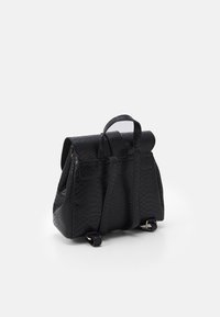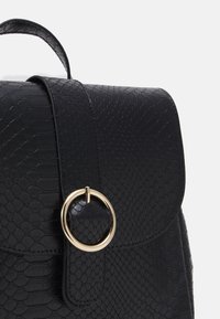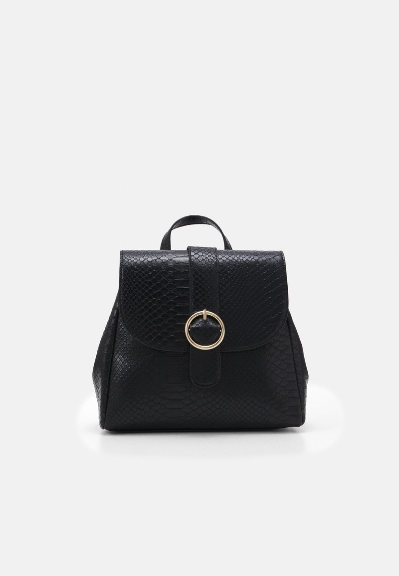 Petit sac à dos noir avec surface texturée, fermeture à rabat, boucle circulaire dorée et poignée supérieure sur un fond clair uni.