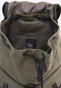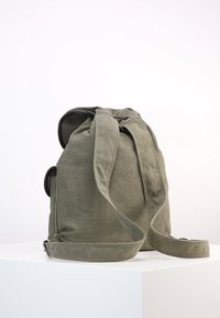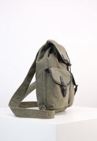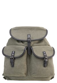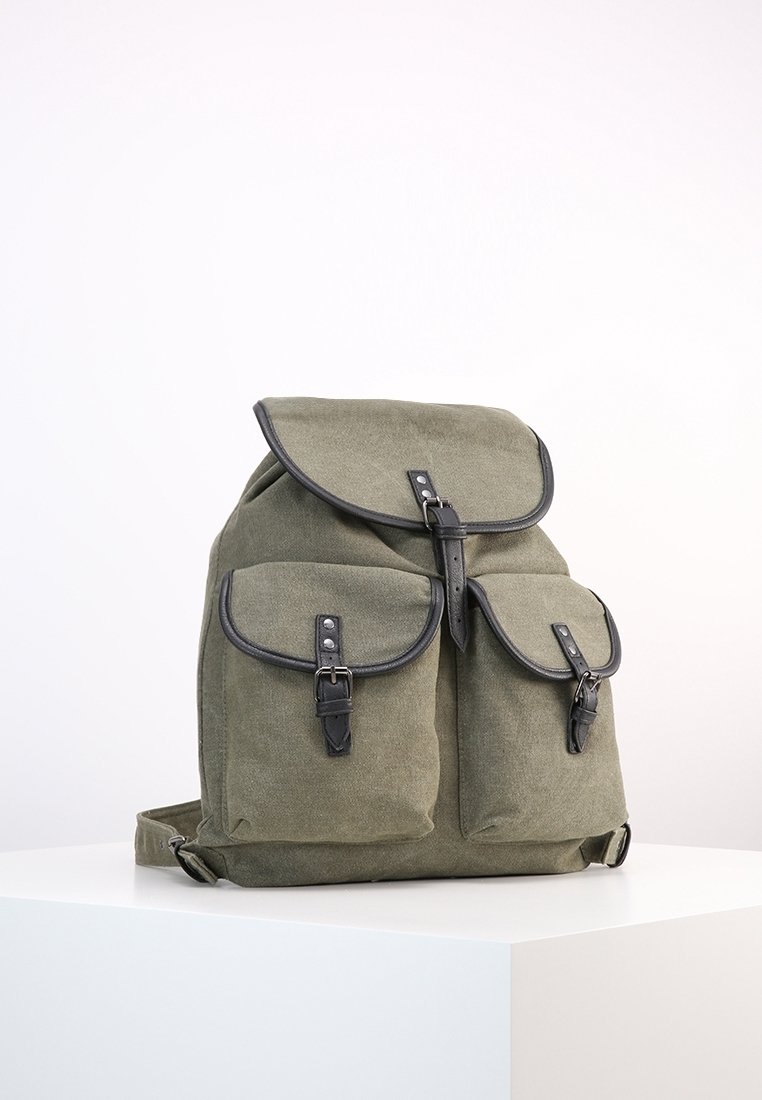 Sac à dos en toile vert olive avec boucles en cuir noir, comportant un rabat principal et deux poches avant, posé sur une surface blanche.