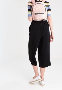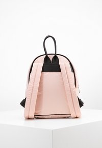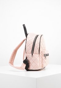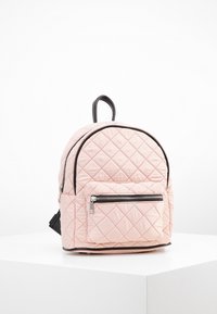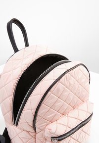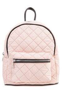 Sac à dos matelassé rose avec une poche avant zippée, un dessus arrondi et des bordures noires. Dispose d'une poignée supérieure et de bretelles réglables.