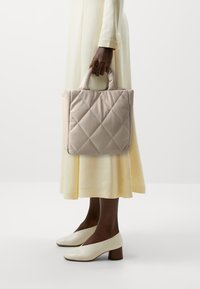 Personne en robe crème tenant un sac à main matelassé beige, portant des chaussures crème à petits talons sur un fond clair uni.