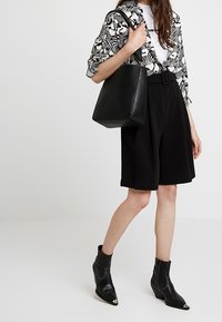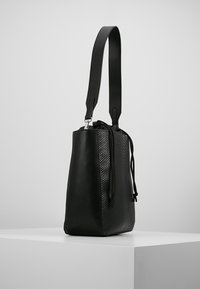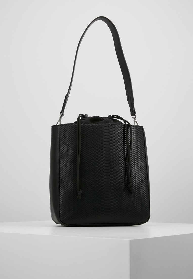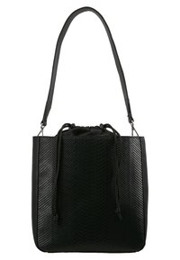 Sac seau en similicuir noir avec un motif texturé effet peau de serpent, fermeture à cordon et une longue bandoulière réglable.
