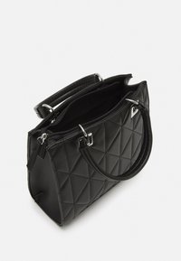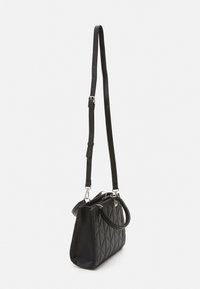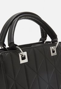 Sac à main matelassé noir à forme structurée, doté de deux poignées courtes et d'une bandoulière amovible. Détails en métal argenté de forme carrée.