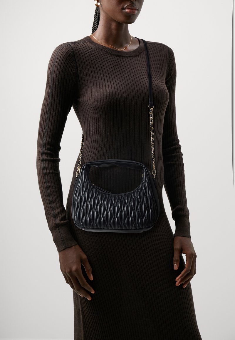 Sac à main noir matelassé avec une poignée courbée et une bandoulière chaîne, présentant une surface texturée et un design élégant, porté avec une robe marron côtelée.