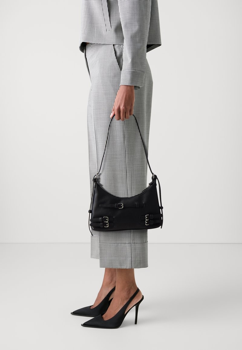 Femme portant un tailleur-pantalon à carreaux, tenant un sac à main en cuir noir avec des détails à boucle, chaussée de talons hauts noirs à bouts pointus, debout sur un sol blanc.