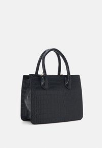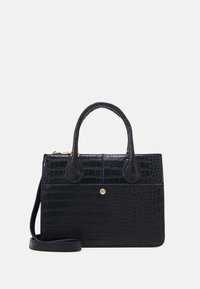Sac à main noir embossé crocodile avec deux poignées courtes, forme rectangulaire, texture lisse et détail bouton doré. Positionné à côté d'une jupe marron.