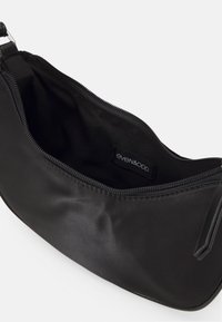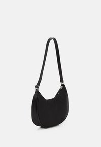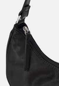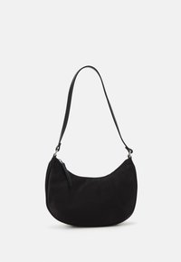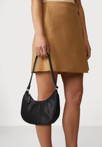 Sac à main en cuir noir avec une forme incurvée, une courte bandoulière et une fermeture éclair, tenu par une personne portant une jupe beige.