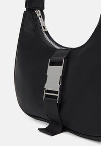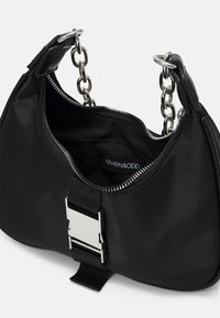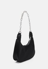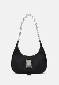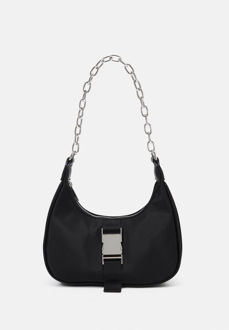 Sac à main noir en nylon avec une forme incurvée, une bandoulière en chaîne argentée et un détail de boucle à l'avant. Dispose d'une fermeture éclair et d'une texture lisse.
