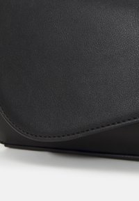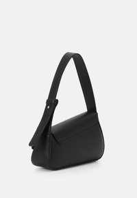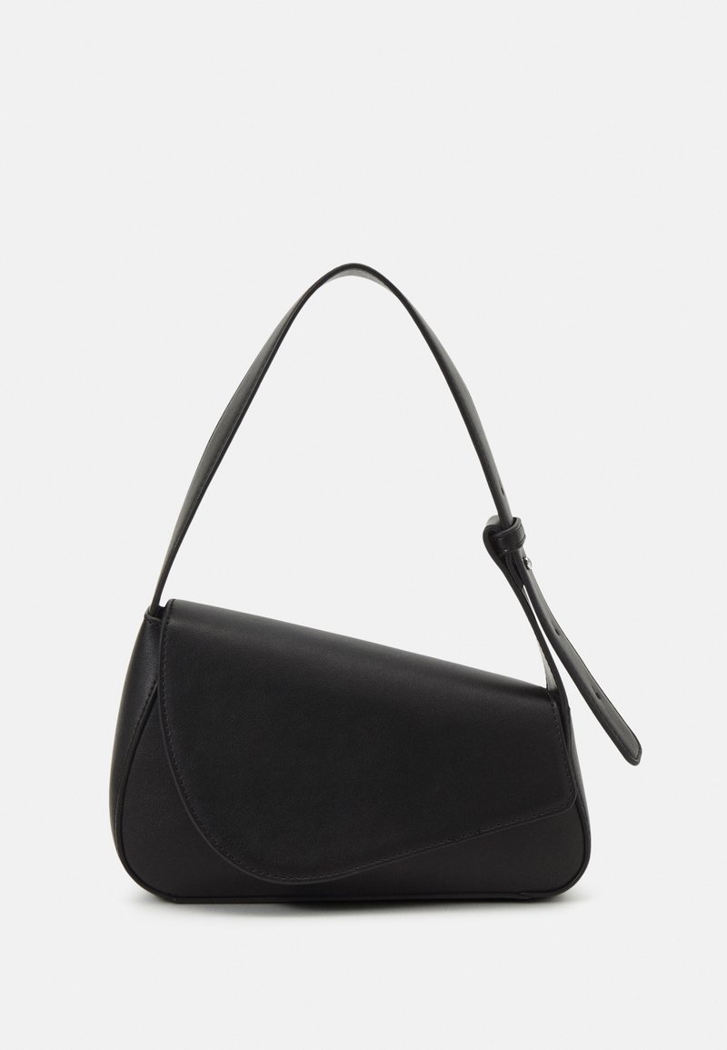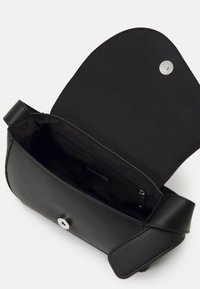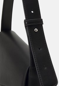 Sac à bandoulière en cuir noir avec fermeture à rabat courbe et sangle ajustable, présenté sur un fond blanc.