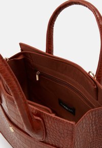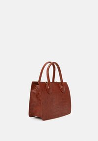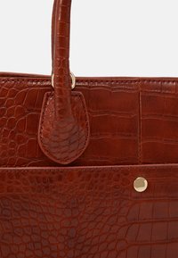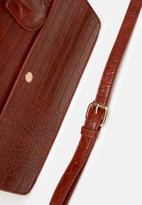 Sac à main en cuir marron à texture crocodile avec deux poignées supérieures, poche avant avec bouton-pression, et une longue bandoulière sur fond blanc.