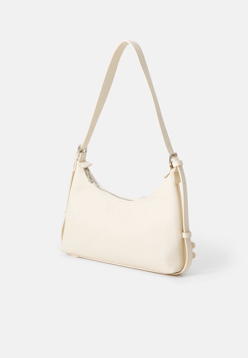 Sac à main en cuir couleur crème avec une forme incurvée, une sangle réglable unique et une fermeture éclair. Présente une texture douce et des accents de quincaillerie minimalistes.