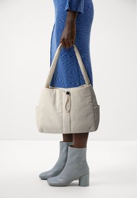 Personne en robe bleue côtelée tenant un grand sac à main beige rembourré, portant des bottines gris clair à talons moyens, devant un fond uni.