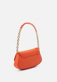 Sac à main en cuir orange avec rabat avant incurvé et bandoulière en chaîne mélangeant rouge et or, présenté sur un fond clair uni.
