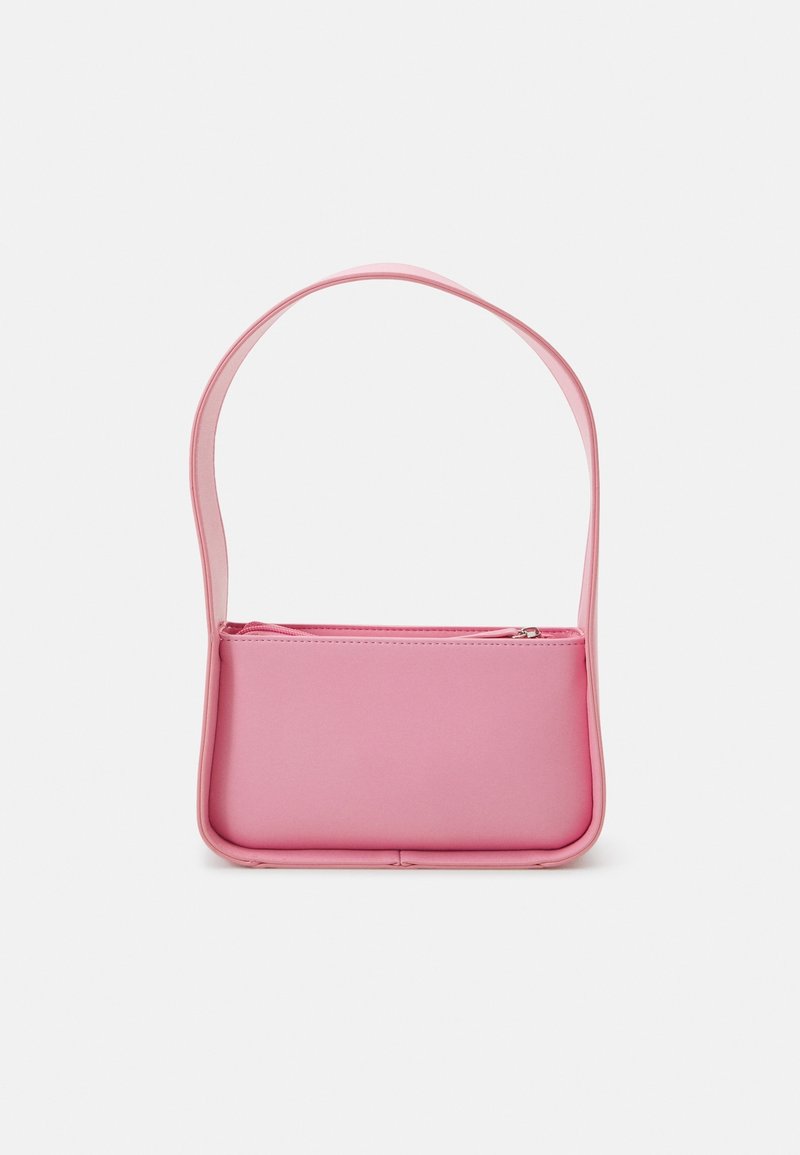 Sac à main synthétique rose à texture lisse, de forme rectangulaire, avec une seule sangle réglable. Comprend une fermeture supérieure zippée.