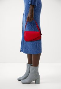 Sac à main en cuir rouge avec une poignée supérieure, un rabat ouvert et une poche intérieure zippée visible avec une fermeture magnétique dorée.
