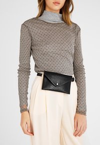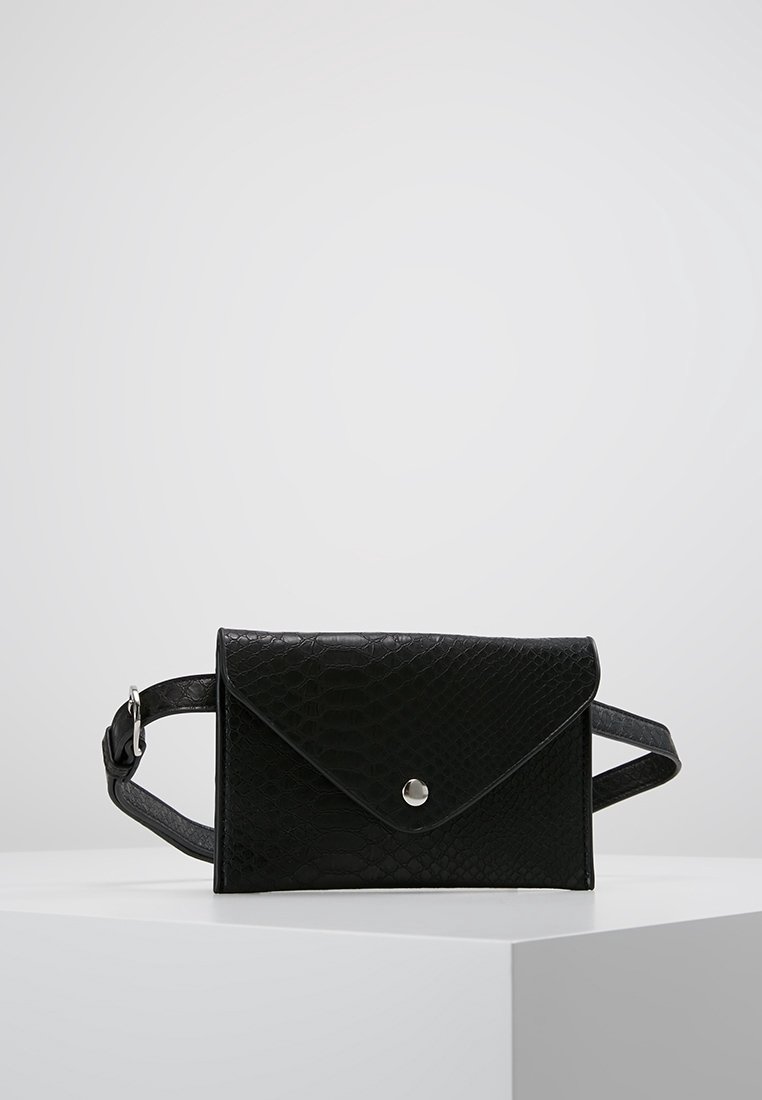 Sac banane noir à texture imitation crocodile avec rabat en forme d'enveloppe et bouton-pression argenté, sangle réglable présentée sur une surface blanche.