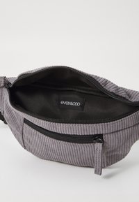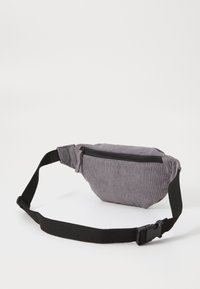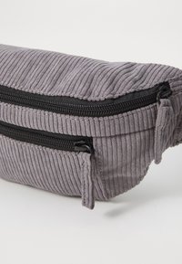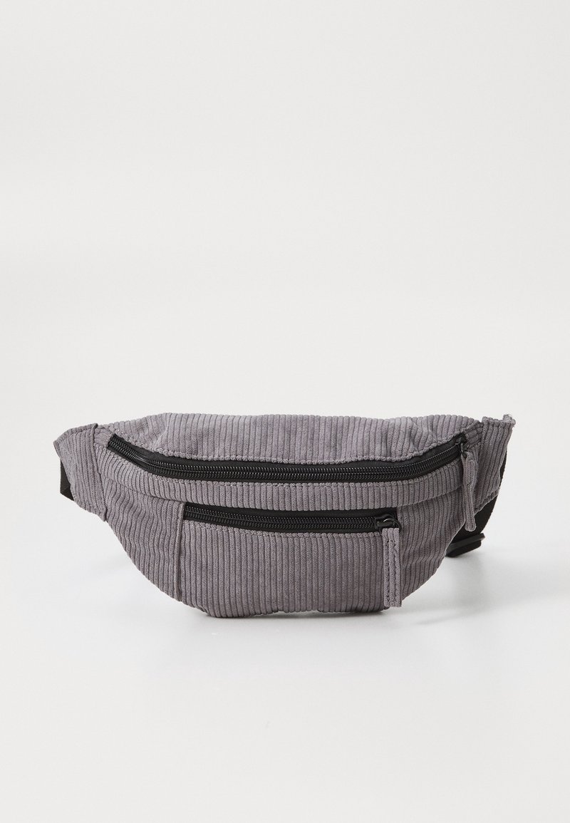 Sac banane en tissu velours côtelé gris avec deux poches à fermeture éclair noires et une sangle ajustable sur fond blanc uni.