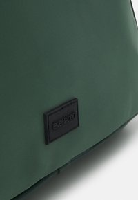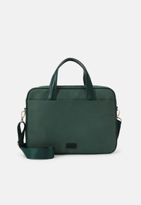 Sacoche d'ordinateur portable rectangulaire vert foncé avec deux poignées, une bandoulière amovible et une étiquette avant sur un fond clair uni.