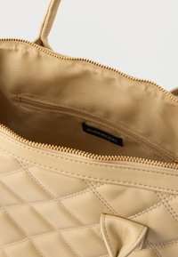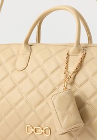 Sac à main matelassé beige avec double poignées, bandoulière amovible, porte-clés chaîne dorée et boucle décorative dorée à l'avant.