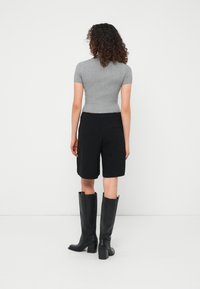 Personne portant des bottes noires montantes jusqu'aux genoux, un short noir arrivant aux genoux, et un haut gris sans manches à côtes avec une fermeture éclair à l'avant.
