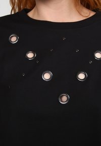 Sweat-shirt noir avec de grands œillets en métal le long du devant et des manches. Fabriqué dans un tissu doux avec une coupe décontractée et des poignets côtelés.