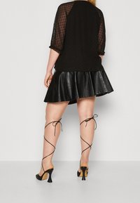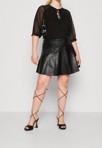 Blouse noire avec des manches transparentes à pois, col rond avec détail à nouer et poignets volants, associée à une jupe en cuir noire.