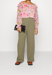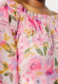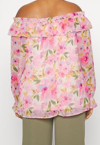 Haut transparent à épaules nues arborant un motif floral en rose, violet et vert. Encolure froncée et longues manches légèrement bouffantes avec des poignets.
