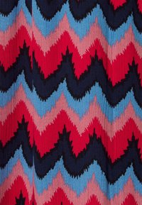 Robe maxi avec un motif en zigzag bleu, rose et noir. Tissu léger, bretelles spaghetti et silhouette fluide.