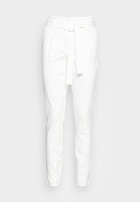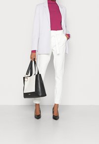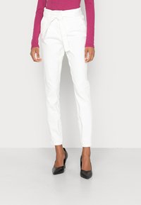 Pantalon blanc tailleur à taille haute avec ceinture, doté de poches latérales, coupe slim et texture lisse. Paire de talons hauts noirs.