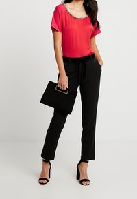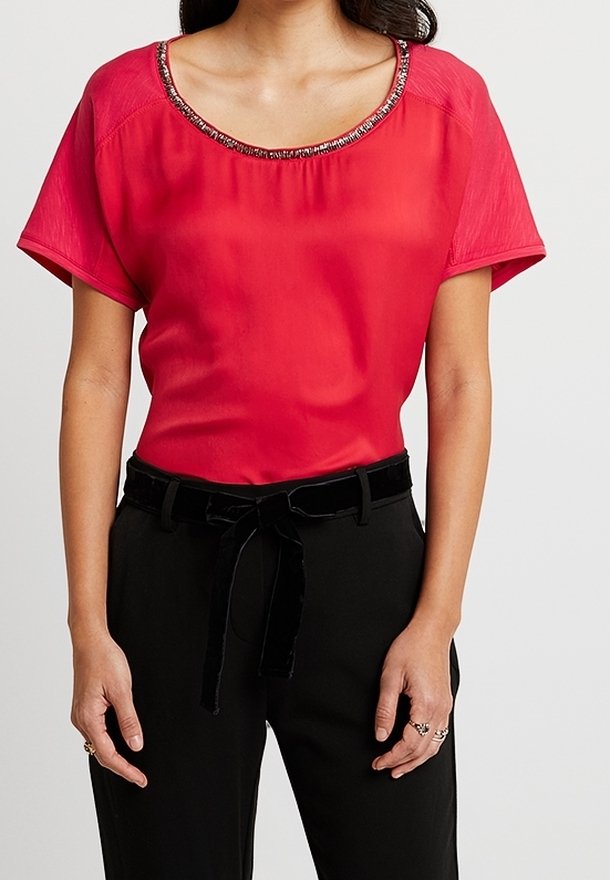 Haut rouge à manches courtes avec un large décolleté et un accent perlé autour du col, associé à un pantalon noir taille haute et une ceinture en velours.